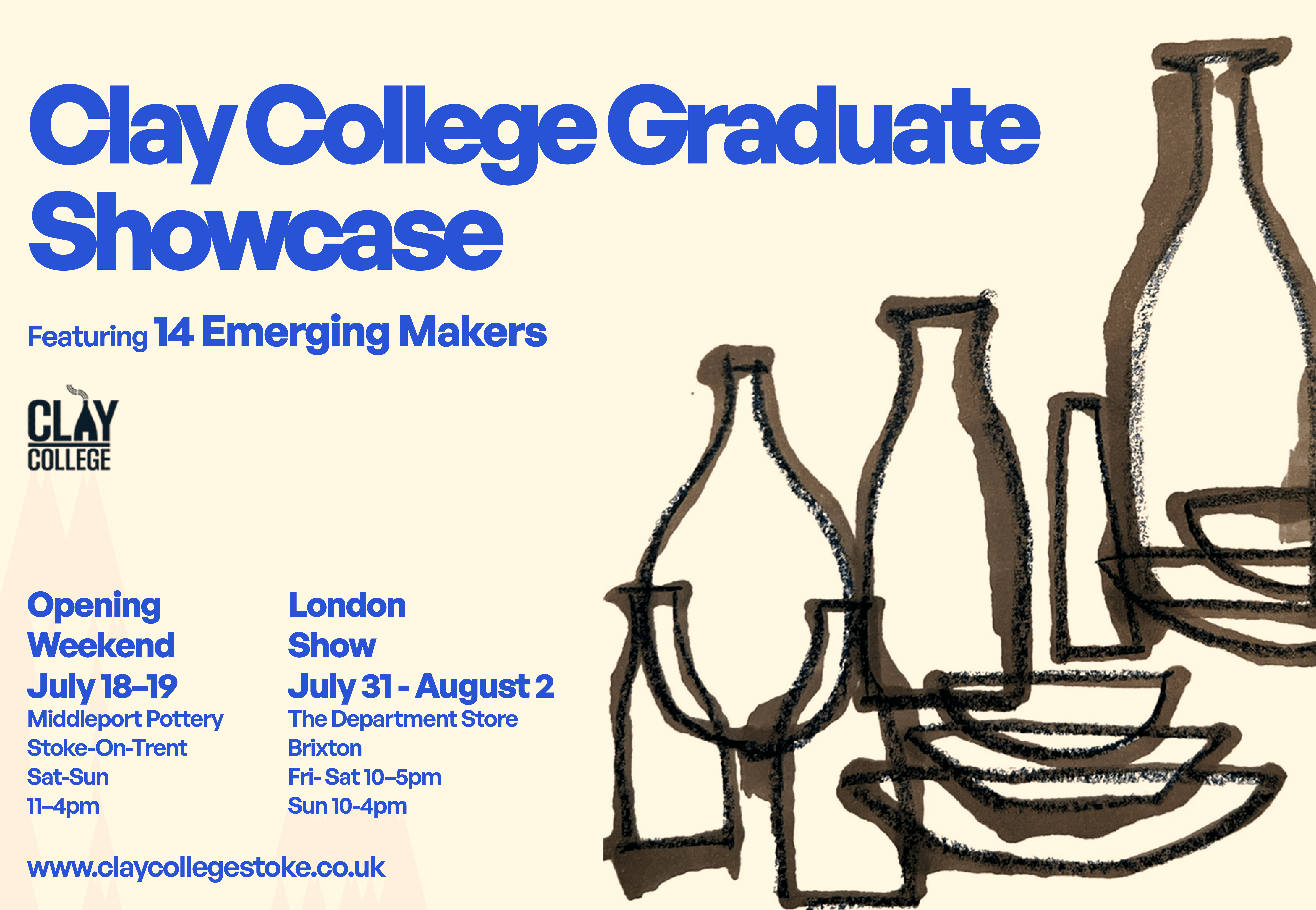This summer, Clay College Stoke will be exhibiting the work of their 14 full-time Diploma students in their Graduate Showcase. The exhibition marks the culmination of two years of technical study and creative exploration in clay and will be exhibited for sale in both Stoke on Trent and at The Department Store, Brixton! Donโt miss your chance to view, discuss and buy from these emerging makers at the forefront of the next wave of studio pottery.